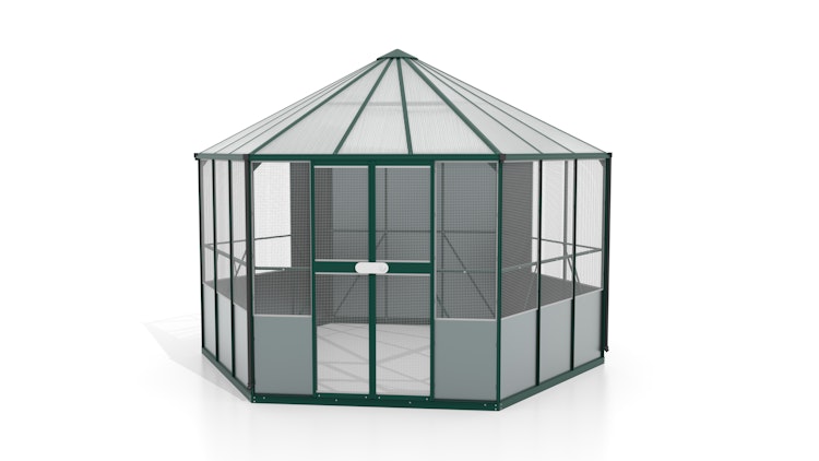 Die Vogelvoliere ist in den Farben Aluminium eloxiert, Smaragd oder Schwarz pulverbeschichtet erhältlich. Zur umfangreichen Standardausstattung gehören: ein Stahlfundamentrahmen, Regenrinnen, drei Regenfallrohre, gerahmte Edelstahlgitter, widerstandsfähige Aluminium-Sandwich-Paneele in mattem Salbei-Grau, die den Tieren Orientierung und Rückzugsoption bieten. Ebenfalls dazu gehört und eine komfortable Doppelschiebetür (B: 80 cm, H: 177 cm) mit hochwertigem Zylinderschloss, die den bequemen Zutritt erlaubt.