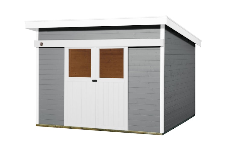 Hochwertiges Weka 21 mm Schiebetürhaus 225 mit attraktivem Pultdach und praktischer Doppel-Schiebetür. Das Gartenhaus ist Teil der vielfältigen Weka Stockton Serie.