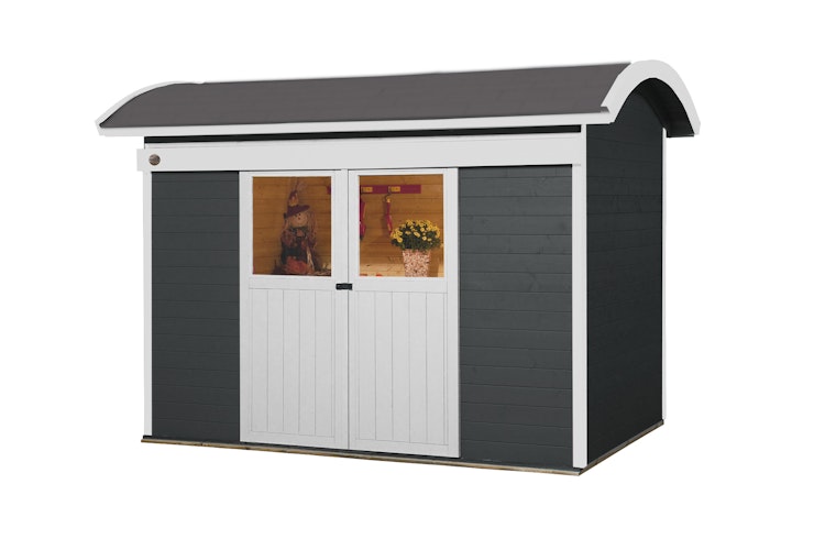 Formschönes Weka 21 mm Schiebetürhaus 228 mit attraktivem Bogendach, platzsparender Doppel-Schiebetür und 16 mm Massivholzboden. Das Gartenhaus ist Teil der vielfältigen Weka Stockton Serie.