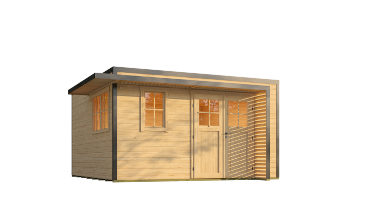 Das Modell in der Größe 400x400 cm und mit einer Wandstärke von 44 mm bietet durch die Doppeltüren einen leichten Zugang und unkompliziertes Verstauen von Geräten. In die Türen integrierte Fenster lassen reichlich Tageslicht herein, und die mitgelieferten Zierleisten können nach Wunsch angebracht werden. Optional kann das Gartenhaus mit zwei zusätzlichen Fenstern bestellt werden.