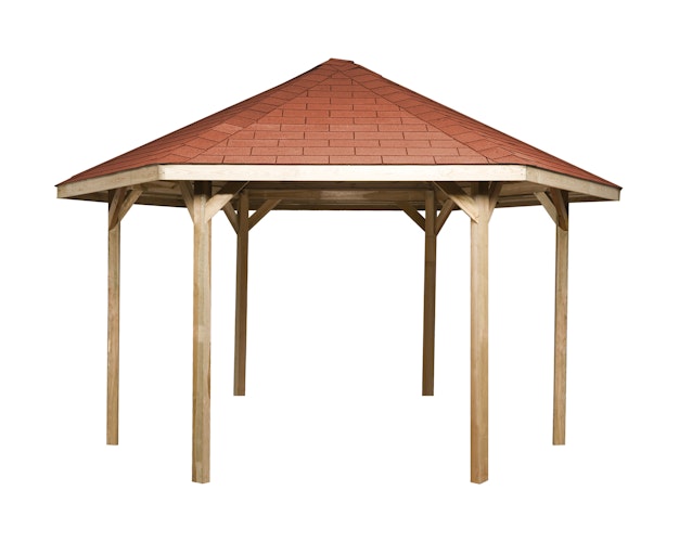 Romantische Weka 6-Eck Pavillon 656 mit 19 mm Massivholzdach im günstigen Sparset inkl. roten, rechteckigen Dachschindeln