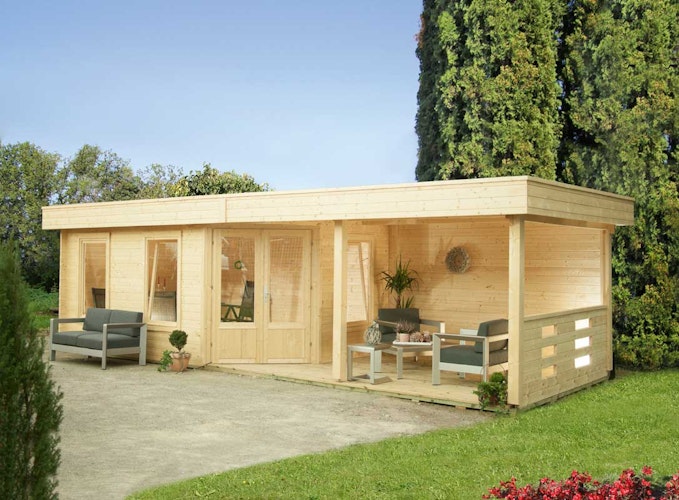 Das Wolff Finnhaus Gartenhaus Maja 40-B / 1-Raum bietet höchste Stabilität durch die 40 mm Blockbohlen. 1 Leimholz-Doppeltür, 3 Ausstell-Einzelfenster und ausreichend Dachpappe sind im Lieferumfang enthalten. Optional kann das Haus mit einem Terrassenset ergänzt werden. Das Terrassenanbau-Set besteht aus einem Seitendach, einer geschlossener Rückwand, einer seitlicher Brüstung und imprägnierten Terrassendielen und ist in einer Breite von 250 oder 350 cm erhältlich.