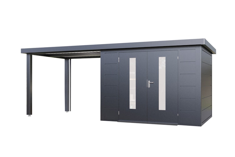 Wolff Finnhaus Premium Metall Gartenhaus Elvar 6024 Anthrazit inkl. 300 cm Anbaudach
