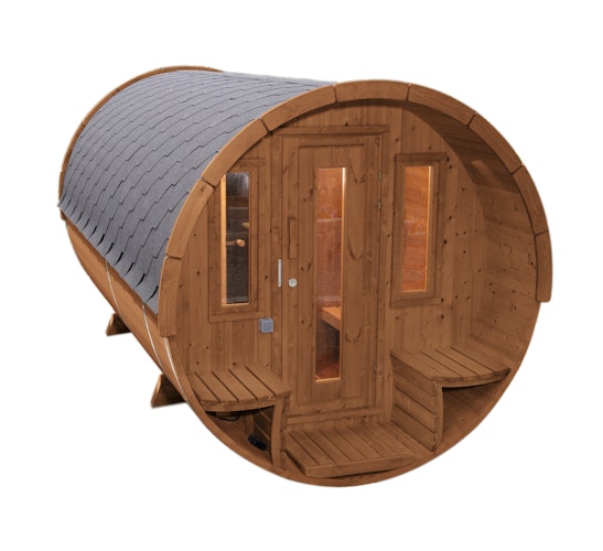 | Besonderheit | Das Saunafass können Sie entweder als Bausatz zur Selbstmontage oder als komplett montiertes Produkt erwerben, welches nur noch vom LKW abgeladen wird. Die Lieferung erfolgt in beiden Fällen bis zur Bordsteinkante. Bei den komplett montierten Saunafässern müssen der Schornstein sowie die Außenblenden bauseits montiert werden. |