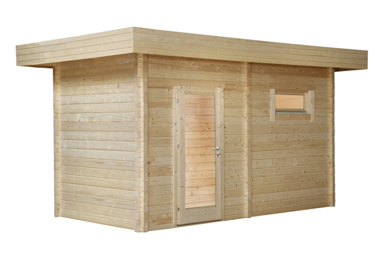 ![]() | Bei dieser Pultdach-Sauna werden stabile 70 mm Blockbohlen verwendet. |