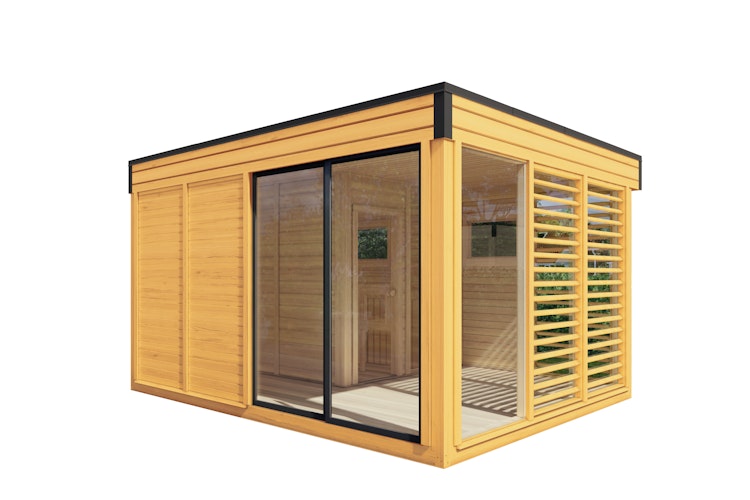 Das Saunahaus Paradiso 4 x 3 m bietet Saunavergnügen auf höchstem Niveau in modernem Design. Die Besonderheit der Modelle aus dieser Serie ist die Austauschbarkeit von Wand- oder Glaselementen, um damit eine ganz auf Ihre Wünsche abgestimmte Optik zu erhalten.